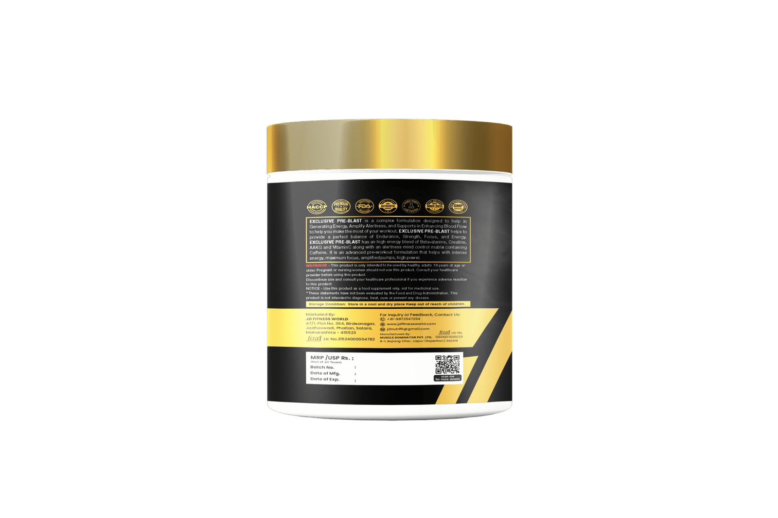 JD Exclusive Pre Blast combines scientifically-backed ingredients that work synergistically to deliver superior performance. Our advanced blend includes potent amino acids, natural stimulants, and essential vitamins to fuel your muscles and elevate your endurance. This pre-workout powerhouse not only boosts your energy levels but also enhances blood flow, allowing for better nutrient delivery and muscle recovery post-exercise.